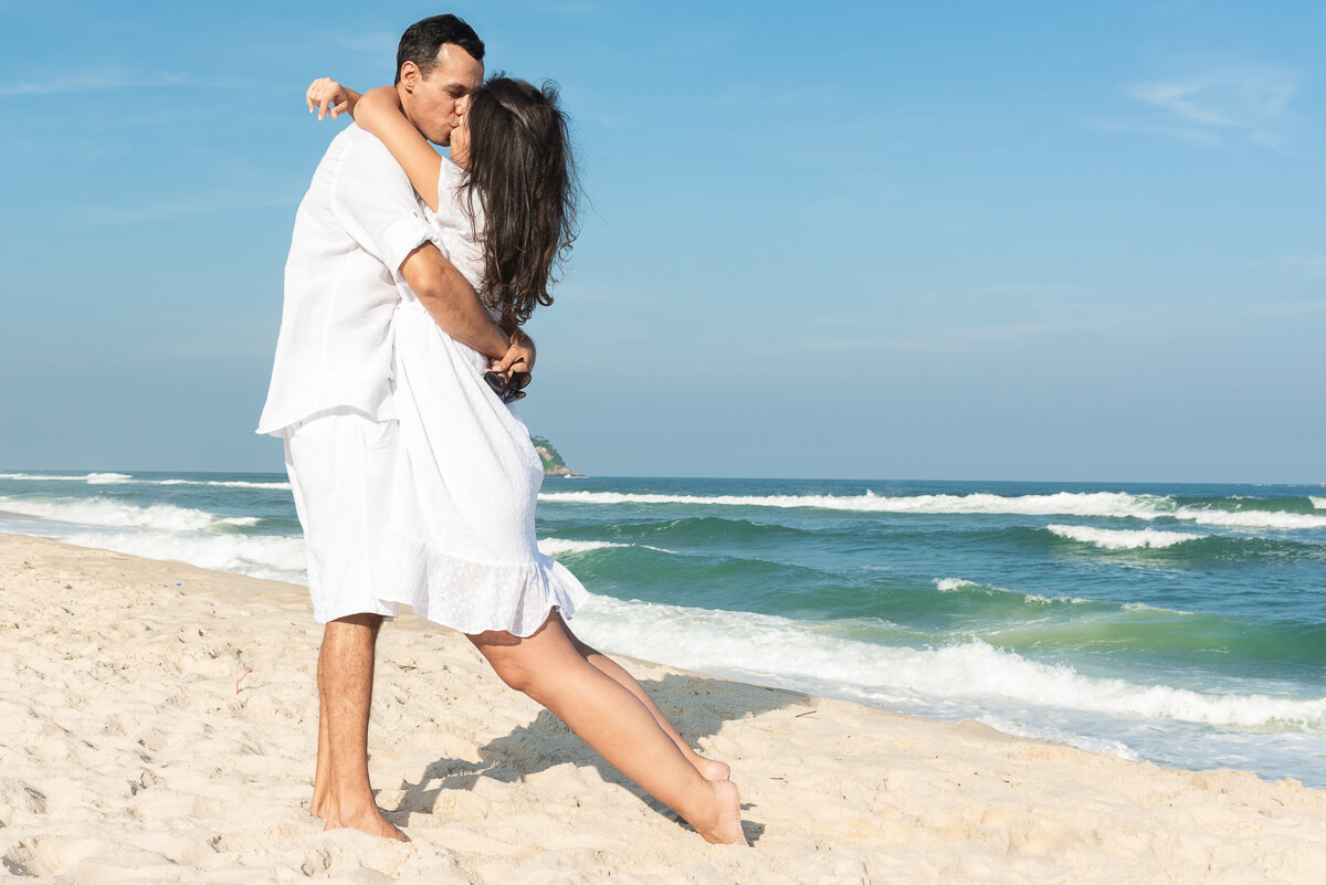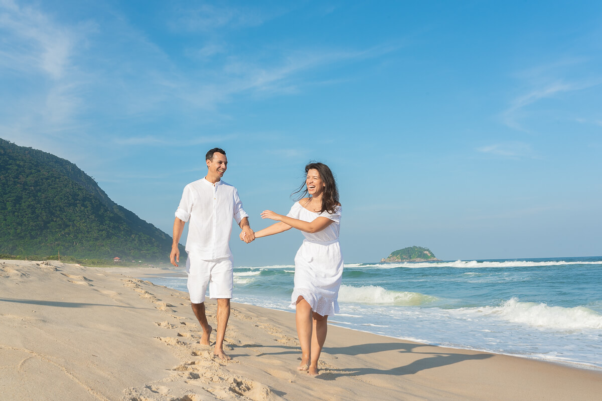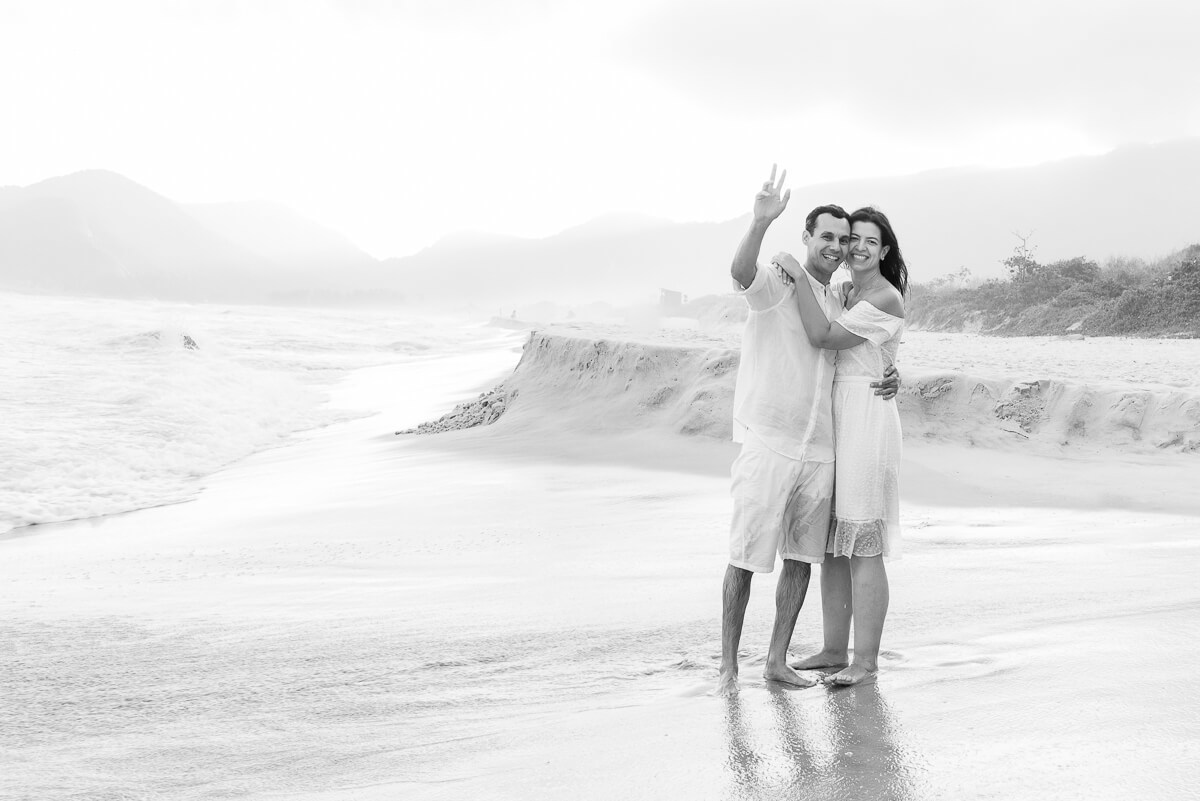 Casamento para mim é algo que valorizo muito. Acredito na família e no amor acima de tudo e fico muito feliz quando vejo casais que celebram 10, 20, 30, 40, 50, 60 anos de vida a dois!!! Eu e meu marido comemoramos esse ano onze anos de casados, fizemos Bodas de Aço e somos muito abençoados por Deus!! Somos católicos e fazemos um trabalho voluntário na Pastoral dos Noivos, que antecede o momento do matrimônio para a igreja católica. Esse momento marcou muito a nossa vida quando, há 11 anos, fizemos o nosso encontro de noivos, em Belo Horizonte/MG. Bem, estou falando tudo isso, porque além de participar da pastoral eu fiquei pensando o que poderia fazer a mais por esses casais que estão iniciando a sua vida matrimonial. Então, pela minha profissão de fotógrafa, achei que seria interessante sortear um voucher de ensaio de casal durante o encontro como forma de presenteá-los. Eles poderiam escolher se seria um pre wedding ou um pós wedding, de acordo com a vontade deles. Foi exatamente assim que conheci esse casal lindo e super simpáticos que são a Juliana e o Wallace, ganhadores do voucher!! Após o encontro de noivos, marcamos uma data para nos reunirmos e nos conhecermos melhor e conversamos sobre o nosso ensaio. A Jú e o Wallace já tinham feito um ensaio de pre wedding no Aterro do Flamego e na Praça Paris, cujas fotos lindíssimas foram usadas para o site deles e para o convite que ficou muito bonito! Optaram, mesmo assim, por fazerem mais um ensaio de pre wedding, mas dessa vez na praia. Por gostarem muito de natureza e praias, logo sugeriram a Praia de Grumari, como o lugar em que gostariam de estar! O Wallace comentou que gostaria de estar em uma praia que fosse só deles no dia do ensaio e tivesse a natureza em volta e a opção de Grumari, principalmente durante a semana, atenderia bem essa expectativa dele! Começamos então a conversar sobre o estilo de roupas e sugeri o branco como a cor predominante, pelo contraste com o verde da mata e o azul do mar. A Jú falou que já tinha um vestido lindo branco, feito pela sogra dela e que então usaria ele. Acertamos então a data e horário e estávamos prontos para o ensaio! Havia chovido na semana anterior à data marcada, mas estava acompanhando a previsão do tempo e já sabia que no dia do ensaio a previsão era de sol. Dito e feito, o dia amanheceu muito lindo e claro, com uma pequena névoa que deu todo o charme durante o ensaio. A Jú e o Wallace estavam muito lindos, felizes e radiantes! A minha amiga Isabella nos acompanhou neste dia fazendo a função de assistente e making of e chegou a tirar mais fotos do celular dos bastidores do que eu na câmera! kkkkkk Tem registro até de quando eu subi na escada (sim, levei uma escada para o ensaio!!) para fazer um click no meio da rua!!! Muito bom!!! Muito obrigada Bella! Adorei!! Os pais da Jú foram nos encontrar na praia para acompanhar o ensaio e, claro, que esse momento teve que ser registrado!! São muito simpáticos e era nítido o carinho e o orgulho deles com a filha e o genro!! Foi um dia muito especial! Gratidão por esse casal lindo que me deu a oportunidade de clicar um momento tão importante de suas vidas!!! Que Deus os abençoem e os guiem por toda a caminhada de vocês!! Assistam ao vídeo e, em seguida, vejam as fotos abaixo.