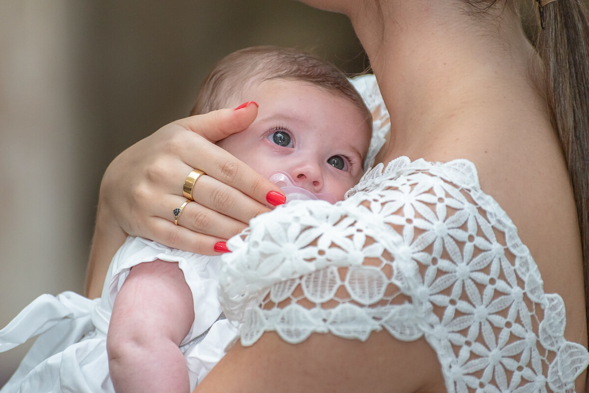 A Manu estava linda, parecia uma princesinha!!! Ora no colinho da mamãe e ora no colinho do papai, ela observava tudo o que acontecia ao seu redor durante a cerimônia. Os seus olhinhos brilhantes estavam sempre atentos a tudo e a todos... uma benção de Deus na vida dessa família querida!!